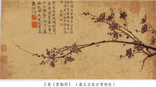 王冕的题诗运用“画作真会”的技法写成。首句暗用宋苏易简《文房四谱》中有关王羲之的典故。传说会稽王羲之家有洗砚池,他每天在池中洗笔砚,池水尽黑。画家自己也姓王,故曰“吾家”。王冕不说自己画的梅花墨色清淡,却说我家池砚池边的梅树,受黑色池水的浸润,开放出淡墨痕的花瓣,将画梅当作真梅,意趣无穷。第三、四句,代墨梅立言:不要人家夸说我颜色鲜艳,只求让我的清香之气流播开去,布满天地间。诗意显然脱胎于宋陈与义的《墨梅》诗中“意足不求颜色似”,意味比原诗尤见深长。诗人托物言志,借画梅以抒写自我心志,表达自己的博大胸怀、清正品格和高尚情操。全诗以画作真,诗情画意融合无间,意蕴深邃,耐人寻思,洵为题画诗中的上乘之作。