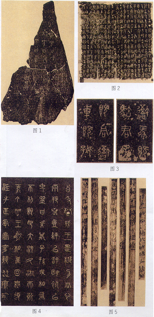 由于古代生产力低下,限于种种条件,中国古代“书”的材料也是多种多样的。除了使用竹帛作为书写材料外,曾经使用的材料还有甲骨、陶、青铜、石头、玉、铁等等。殷代武丁时期的龟甲刻辞和牛胛骨刻辞图一,见封三,下同,半坡遗址等出土的陶器刻画符号,康王时代的大孟鼎铭文图二,春秋时期秦刻石鼓文图三,战国时期秦刻诅楚文图四,战国时期竹简图五,等等,这是我们目前能见到的最古老、最原始的“书”。这些就是中国“书”之源。