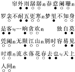 )表示可平可仄之字;《啸余谱》以竖线(|)表示平声,仄声不标注。《词律》以名篇词为谱,凡字声平仄不易者依原词字,不再标注;凡可平可仄之处则于字之左旁注明“可仄”或“可平”。这样,我们使用《词律》时,还得去辨识词例中的字声平仄,极不方便,亦感不甚准确。《词谱》采用白圈、黑圈和半黑半白圈遍注于谱之右旁,匡正了《词律》的缺憾,故为大多数词学家所认同。现在新编的一些词谱,有的仍是图与谱分列,而标注平仄的符号有的以横线(—)表示平声,竖线(|)表示仄声,或直书平仄。我以为《词谱》的形式最合理,但可平可仄之字不必标出,例如《浪淘沙》: