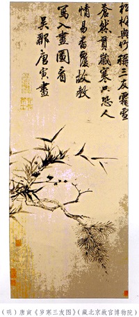 唐寅《岁寒三友图》(见图),今藏北京故宫博物院。这幅画用折枝法画松、竹的枝叶和梅花的疏枝、花萼,三枝集束一起,从左侧出枝,向右方伸展,像插花一样,着墨不多,疏朗明净,秀美雅逸,富有神韵。我们一读宋赵孟坚的绢本《岁寒三友图扇》(藏上海博物馆)、册页《岁寒三友图》(藏北京故宫博物院)的构图方式,便能明白唐寅此画的艺术渊源。画幅上部用极端庄的楷书齐整地题写一首绝句: