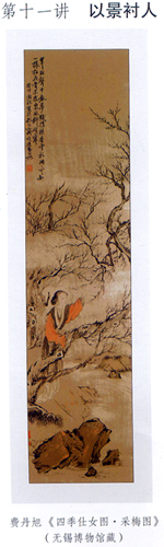 “以景衬人”是人物画中常见的表现技法之一。画家将人物安置在特定的景物中,创造出典型的艺术氛围,以景衬人,借景写人,更好地刻画人物性格、精神和气韵。东晋顾恺之为谢鲲画像,在他的周围画上丘壑,表现他喜爱山水、耽于林泉的情趣。《世说新语•巧艺》论及此事,曰:“画谢幼舆于一岩里,人问所以,顾云:‘一丘一壑,自谓过之’,此子宜置丘壑中。”张彦远《历代名画记》亦有相似的记载。沈宗骞《芥舟学画编》卷四论及“人物辅佐”时写道:“梅须瘦而清,相对者诗人、词客,竹欲而韵,宜称者逸士、佳人。凡此形容,皆笔墨所出,而各得其神。”这种艺术传统,在后代的人物画中被广泛地运用着。