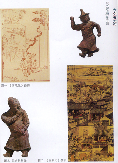 “一代有一代之文学”,继唐诗、宋词之后,蔚为一代文学之盛的元曲,有着它独特的魅力。元曲的组成,包括两类文体:一是散曲,包括小令、带过曲和套数;二是剧曲,即杂剧,由套数组成的曲文,间杂以宾白和科范,专为舞台上演出。杂剧的产生,标志着中国古代戏曲样式在元代逐渐完备。元代出现了关汉卿、王实甫等一批戏曲大师,以及《窦娥冤》、《西厢记》等著名作品。以关汉卿为例,他一生创作杂剧67部。今存18部。除《窦娥冤》外,还有《救风尘》、《望江亭》、《拜月亭》、《单刀会》等代表作。他的这些剧作,“写情则沁人心脾,写景则在人耳目,述事则如其口出”。王国维在《宋元戏曲考》中对关汉卿大加赞赏:“关汉卿一空依傍,自铸伟词,而其言曲尽人情,字字本色,故当为元人第一。”关汉卿的戏剧还被译成多种文字,走上世界舞台,是“东方的莎士比亚”。由于时间的推移,元代杂剧的演出盛况,我们已无法详细了解。学习、了解元杂剧,主要是阅读剧本。但仅阅读剧本,而不关注舞台演出,显然是不够的。除了通过现存文字来进行研究外,我们通过与元代杂剧有关的实物、图画等,换一个角度,“另眼看元曲”。明代编《元曲选》中的《窦娥冤》插图(见封三图1)、传世名作《西厢记》插图(见封三图2),均为我们展示了元代杂剧舞台演出的场景。山东出土的元代杂剧人物陶俑(见封三图3),表情生动,形象逼真,从一个侧面展示出元代杂剧的高超艺术水平。这些图和实物,丰富了我们对元杂剧的认识。
