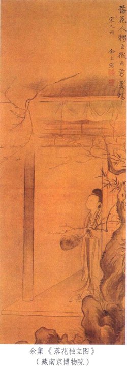 词人在跋语中说:“始时沈十二廉叔,陈十君宠家有莲、鸿、苹、云,品清讴娱客。每得一解,即以草授诸儿 ,吾三人持酒听之,为一笑乐。已而君宠疾废卧家,廉叔下世,昔之狂篇醉句,遂与两家歌儿酒使,俱流转于人间。”当老友或病或殁,歌女小苹等人也流落他乡时,词人不免兴起世事无常的感叹,写下这首追念歌女小苹的作品。前阕开端概括地描绘自己孤独的情景,渲染出当前空寂的氛围,很自然地逗引出与相恋的小苹离别时的“去年春恨”来。“落花”两句,写眼前景,落花时节,伊人不见,故而“人独立”,而双飞之燕,又触发起词人缕缕相思之情。后阕由眼前景转入回忆之中,“记得”两字,领起后阕词的全部内容,先说初见小苹时的景象,再说小苹离别时的情景,与前阕“落花人独立”遥相照应,揭出“春恨”的根源。画家余集看中“落花”两句富有画意,便以之画成这幅《落花独立图》,画境完全吻合晏词的词意。不过,细心的读者也许会发现 ,画家对词境中的主人公已经作了重大转换。原来,晏几道《临江仙》词是抒写自己怀念歌女的情愫,“人独立”中的人,是词人自己。而余集这幅仕女图,描绘画中人受眼前景物的感发,露出孤寂、怅然的心情,她正在忆念外出未归的丈夫,图中“独立”的人,则是一位少妇。画家用宋人词意作画,取其精雅的词意,却转换作品中主人公的性别,形成这首词意画的一个很别致的艺术特征。
