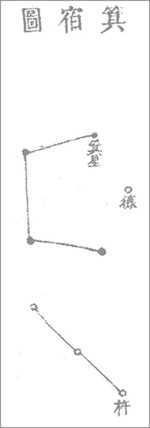 如果说在《诗经》的时代还是“人人皆知天文”的话,那么,尽图一:箕宿图(选自《天文秘略》)管此后天文学知识逐渐专业化,但历代的文学家们还是常常将天文学内容化用在诗文之中,借此抒发自己的情感。如《文选·明月皎夜光》诗:“南箕北有斗,牵牛不负轭。”李善注:“言有名而无实也。”“南箕”为什么在这里比喻有名无实?原来南箕即箕宿,其距星为人马座γ星,由四颗星组成,二星为踵,二星为舌。踵窄舌宽。夏秋之间见于南方,在斗宿之南,故称“南箕”。《诗·小雅·大东》:“维南有箕,不可以簸扬;维北有斗,不可以挹酒浆。”后即以此比喻有名无实。此外,古人还认为箕星主口舌,多用其比喻谗佞。《诗·小雅·巷伯》:“哆兮侈兮,成是南箕。彼谮人者,谁适与谋?”郑玄笺:“箕星哆然,踵狭而舌广。今谗人之因寺人之近嫌而成言其罪,犹因箕星之哆而侈大之。”这两种比喻意义都是通过箕宿的形态来进行联想,但联想的切入点不同,一为功能联想,二为形状联想,其表达的感情也就各异。另外,南箕又称“南星”,如李白《送梁四归东平》诗:“大火南星月,长郊北路难。”南箕在夏秋之际出现在南方,大火星即心宿二,即天蝎座α星。《诗·豳风·七月》之“七月流火”,即指大火星向西方运行的星象,其时正当夏历七月,正是初秋之时。李白诗中所说的“大火南星月”,其实就是七月的代称。
