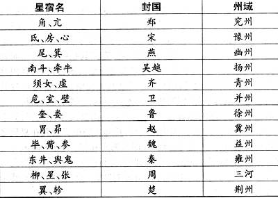 又如,脍炙人口的王勃《滕王阁序》,开头就有“星分翼轸,地接衡庐”的描写,又有“物华天宝,龙光射牛斗之墟”之句。它涉及到古代天文学中的分野说。 天上的列宿对应着地上的封国,这种观念很早就产生了。如《周礼·保章氏》:“以星土辨九州之地所封,封域皆有分星。”具体的分法,《史记·天官书》、《汉书·天文志》、《晋书·天文志》都各有不同。下表是按唐张守节《史记正义》的说法列出的分野:
