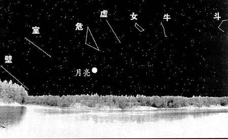 按此赋作于宋神宗元丰八年七月十五日,即公元1082年8月11日,娵訾即二十八宿中的室宿与壁宿。那么,当日的天象究竟如何?我们可以使用一个天文学软件 StarryNight来进行演示。如下图所示,在当天晚上的黄州地区,月亮初升时在危、室之间,离斗、牛二宿距离20度,相隔甚远,所以张尔歧的判断是对的,苏轼的确是在信笔为文。当然,东坡此举无伤大雅,这是《前赤壁赋》的一个有趣的插曲。