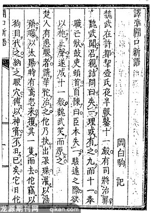 宝历(1751—1763)初年以来发生在京、阪唐话学者中间的汉文笑话创作,与同样流行于此群体中的中国白话小说之阅读热潮、古代笑话之翻译活动并行,又是受到它们刺激的产物,这些汉文笑话或为中国笑话的翻案,或取材于本邦古笑话、巷间流布的落语笑图一:《译准开口新语》书影(1751)(本文书影均取自《日本汉文小说丛刊》第一辑第五册,王三庆等编,台湾学生书局2003年)话,相互融合,精彩纷呈,共同促成了此期汉文笑话的一时流行。不过,这些汉文笑话集中却少有独立创作的作品,多数不是翻案之作,就是翻译之作,此后的汉文笑话创作也属此种情况。这里,我们以冈田白驹《译准开口新语》里的几则笑话为例,展示一下此期汉文笑话作品的一般特色。A组: