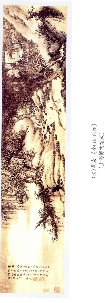 云渺渺,水溟溟。高树低树连阴密,远山近山无数青。中有高人抱幽独,坐卧烟霞隔尘俗。瑶琴一曲来宫商,俯仰乾坤心自足。吴宏书写此诗,不小心于“烟”下漏掉一个“霞”字,为免影响画面的美观,他将霞字补写在全诗的最后,字体略小,这是古代书画家惯用的办法,读画人自能理会。这首平仄交替协韵的古体诗,行笔流畅,画家将自己“寄乐于画”的画心,完全借诗托出。题诗全写画上的景与人,诗与画的对应关系,相当紧密。首两句,从云水迷蒙的画面落笔,云雾渺邈,水气溟濛,迷漫于画幅。次两句,写画面山景,高处的树、低处的树绿阴密接,远处的山、近处的山,构成连绵的青色屏障。以上四句诗,协平声青韵,描写画面上的山与水,再现画境美。“中有高人”以下四句,换协仄声韵,转而写画中人。密林中这位高人,抱着幽独的心志,在烟霞里坐卧,与尘世隔绝。他弹奏一曲瑶琴,送出优美的琴音,高声唱着幽雅的歌曲,心神在天地间游弋,心旷神怡,自己感觉到心灵上的惬意和满足。全诗写景写人,景物与人情相交融,画幅的笔趣墨韵与诗篇的诗情画意,紧相渗透、融通,真是题画诗中的上乘之作。